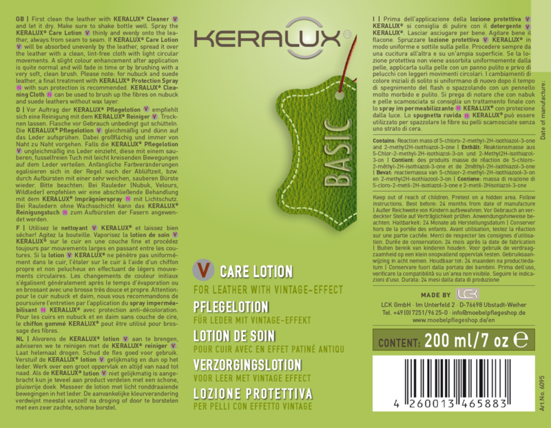 - Voeden / beschermen met de Keralux® lotion. Een dun laagje opsprayen is voldoende. Teveel lotion kun je met de doek inwrijven.